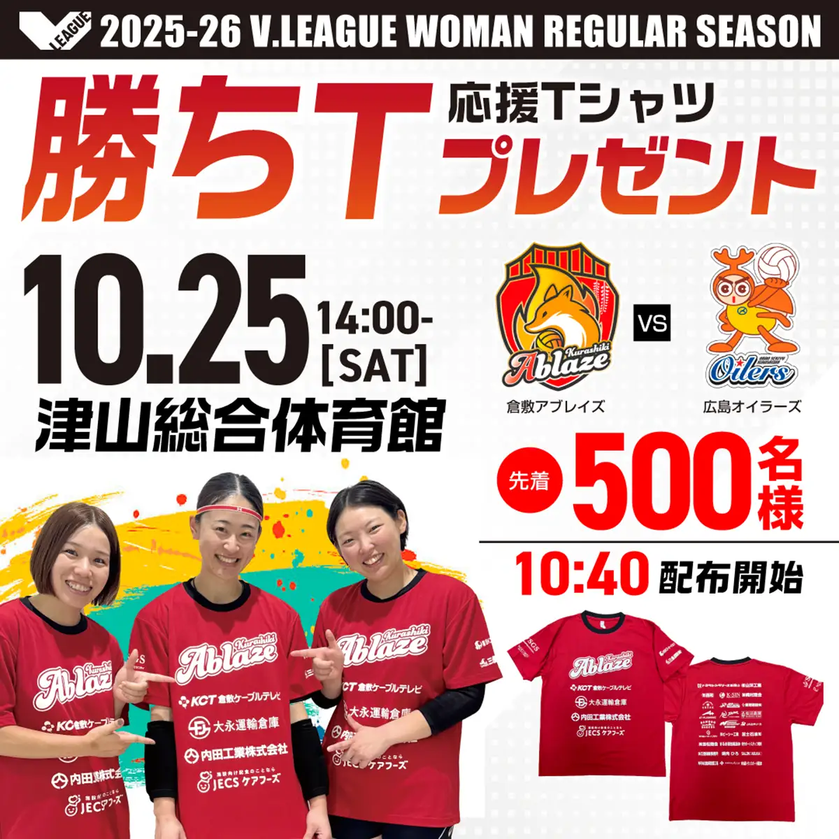 10月25日(土)は来場者先着500名に、チームカラーの応援Tシャツ「勝ちT」を配布。観客全員で会場を真っ赤に染め、チームと一体となって戦いを後押しします。