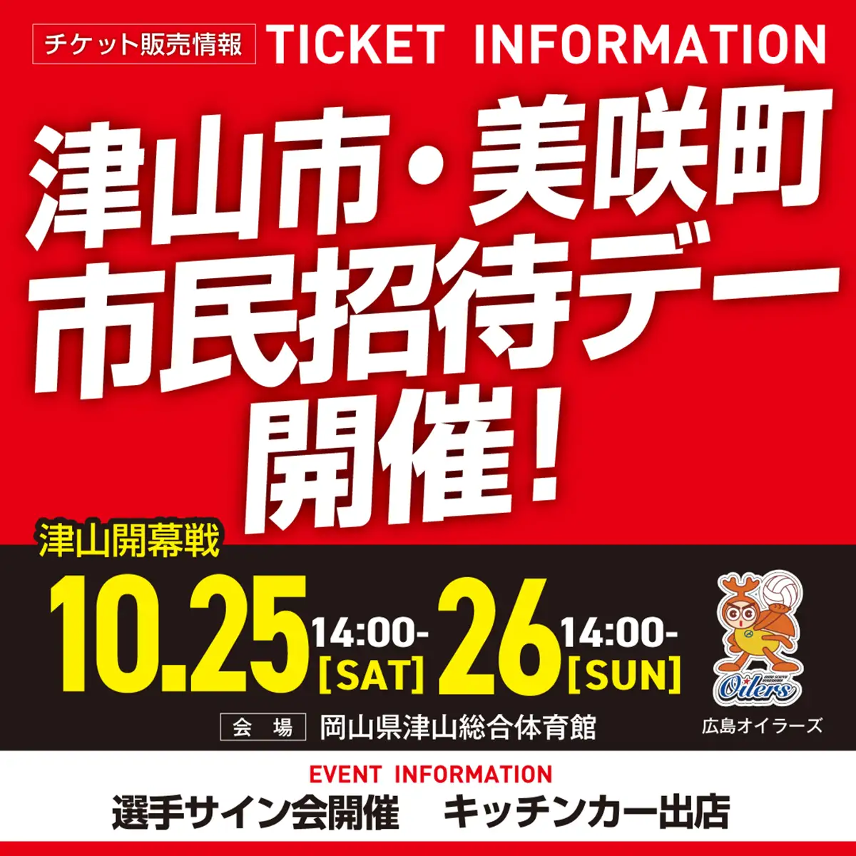 両日とも津山市・美咲町在住の方を対象に、市民招待デーを開催。無料で試合を観戦できる特典が用意されています(事前申込制・詳細は公式サイトへ)。