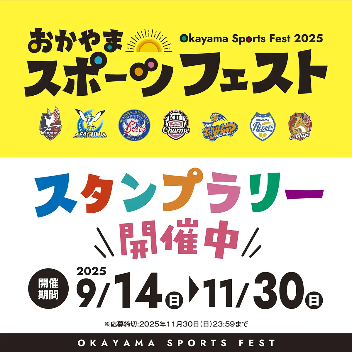 倉敷アブレイズのホーム開幕戦は、県内7チームが連携する「おかやまスポーツフェスト スタンプラリー」の対象試合。アプリ「furari」でQRコードを読み取りスタンプを集めると、サイン入りグッズや岡山名産品が抽選で当たります。2チーム以上の試合を観戦して、岡山のスポーツを巡る楽しみ方も。