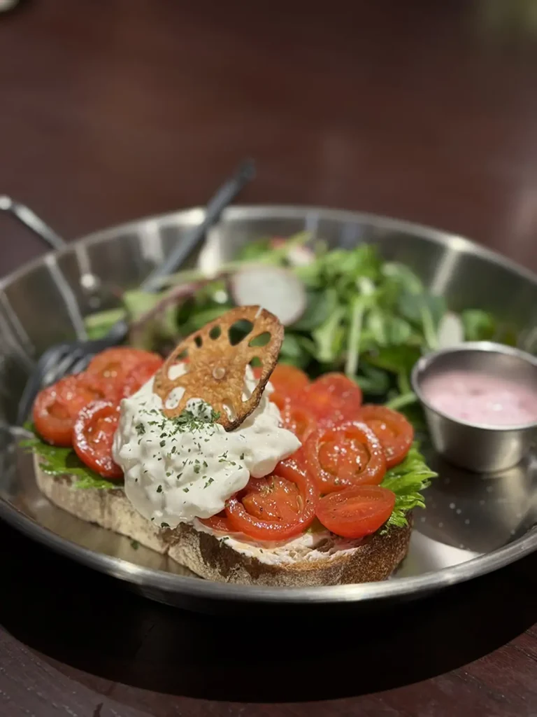 オープンサンドには、岡山県産のフルーツトマト「せとうちルビー」を贅沢にトッピング。甘みと酸味のバランスが絶妙で、ヨーグルトソースとの相性も抜群です。